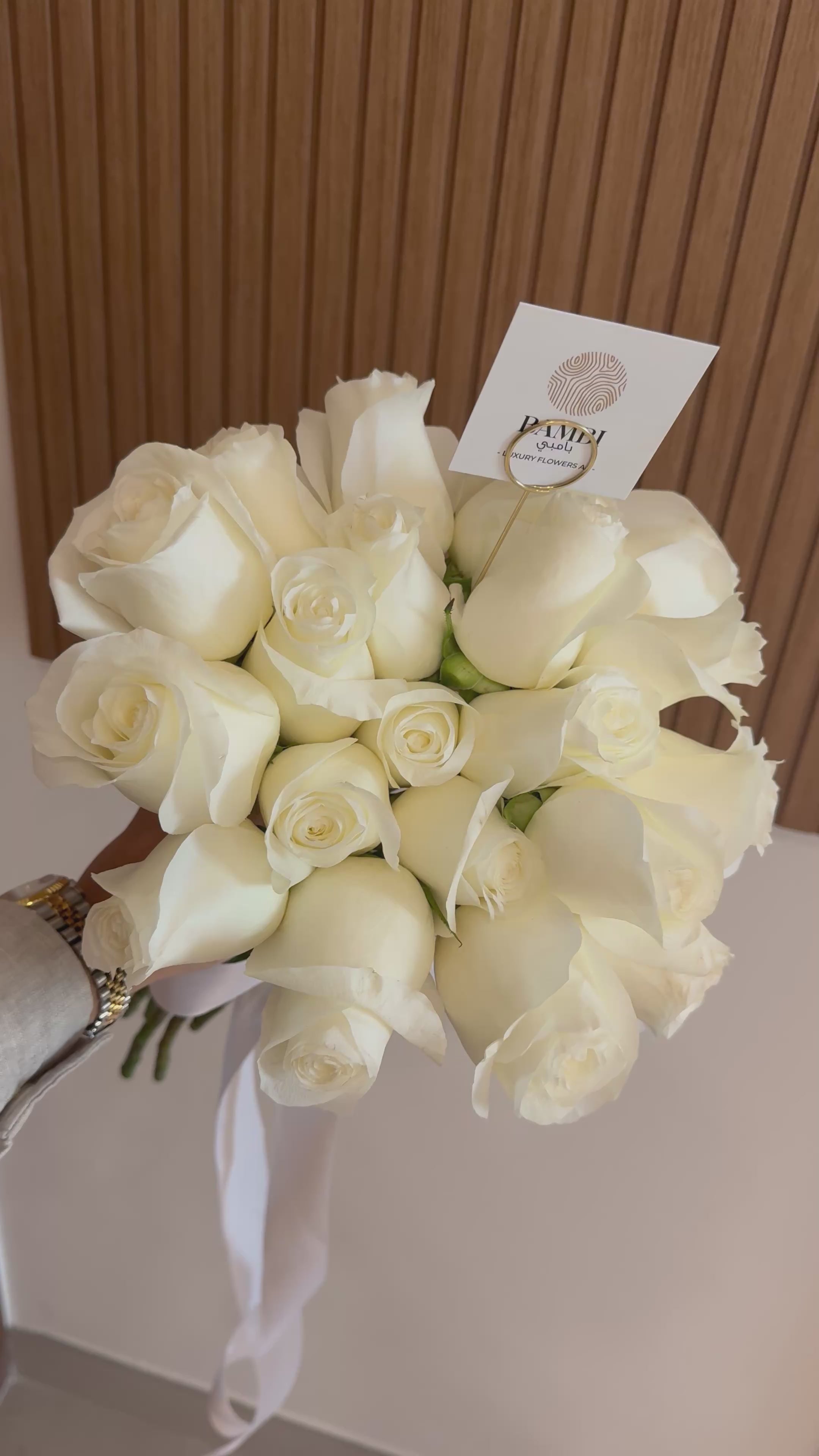 A refined bouquet of fresh white roses arranged in a flawless dome, hand-tied with our signature wrap and satin ribbon. Filler-free styling keeps the focus on velvety petals and clean, elegant lines—perfect for weddings, anniversaries, and thoughtful congratulations.
