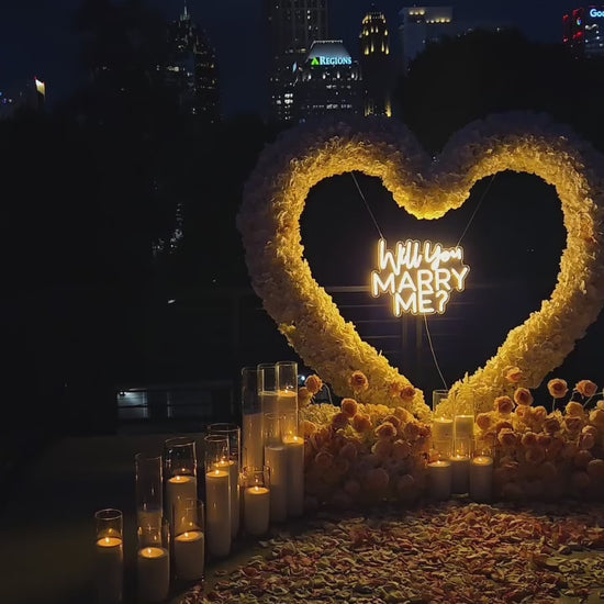 This setup features a large heart-shaped floral installation crafted with white roses, a glowing “Will You Marry Me?” neon sign, and an immersive candlelit arrangement. Hundreds of rose petals are scattered across the floor, creating a dramatic, romantic setting that looks stunning both in person and on camera.